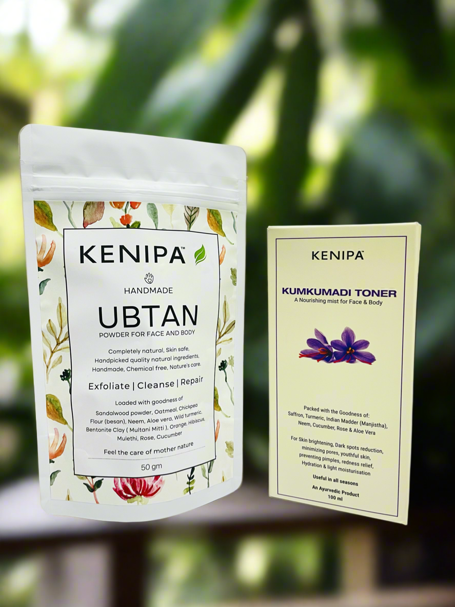 KENIPA HANDMADE UBTAN powder for face and body cleansing 50g and KENIPA Kumkumadi Toner A nourishing mist for Face & Body 100 ml together